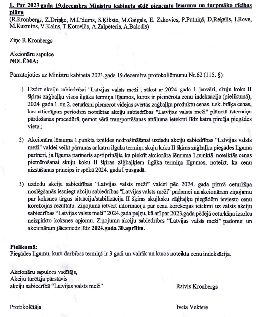 Balstoties uz šo informatīvo ziņojumu, Ministru Kabinets 2023. gada 19. decembrī pieņēma protokollēmumu Nr. 62 (115.), ar kuru uzdod Zemkopības ministrijai kā LVM akciju turētājai nodrošināt, ka sākot ar 2024. gada 1. janvāri akciju sabiedrība Latvijas valsts meži skujkoku zāģbaļķu piegāžu ilgāka termiņa līgumos piemēro vidējās svērtās zāģbaļķu cenas, kas attiecīgam periodam noteiktas akciju sabiedrības Latvijas valsts meži īstermiņa pārdošanas procedūrā. Pēc būtības šis lēmums pavēra atkāpšanās iespēju no līgumsaistībām un cenu korekciju uz leju. Protokollēmumu gatavoja Zemkopības Ministrija, konkrētāk ministrs Armands Krauze un valsts sekretārs Raivis Kronbergs. (Šī pati noziedzīgā grupa 2023. gada sākumā bija uzrunājusi iepriekšējo ministru Didzi Šmitu, bet tas, saprazdams, ko šis piedāvājums viņam nozīmē, atteica.)