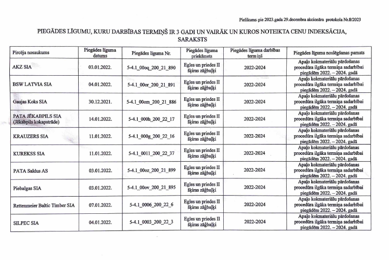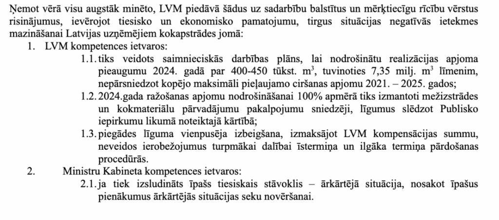 MK lēmuma iespaidā 2023. gada 29. decembrī LVM ārkārtas akcionāru sapulcē ar darba kārtības vienīgo punktu “Par 2023. gada 19. decembra MK sēdē pieņemto lēmumu un turpmāko rīcības plānu” pieņēma lēmumu indeksēt nosolītās II šķiras skuju koku cenas uz leju atsevišķiem tirgus dalībniekiem atbilstoši lēmumam pievienotajam sarakstam (noziedzīgajai grupai) 2024. gada 1. un 2. ceturkšņos. Tāds pats MK lēmums un izrietošs LVM akcionāra lēmums tika pieņemts atkārtoti 2024. gada jūnijā attiecinot to uz 2024. gada 3. un 4. ceturksni.