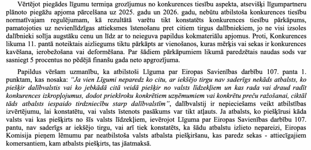 Zemkopības ministrijas amatpersonas, darbojoties pretēji Publiskas personas finanšu līdzekļu un mantas izšķērdēšanas novēršanas likumā, Komercdarbības atbalsta kontroles likumā un Līguma par Eiropas Savienības darbību 107. panta 1. punktā noteiktajam, 2023. gada decembrī nodeva Ministru kabinetam informatīvo ziņojumu “Par Latvijas kokrūpniecības nozares konkurētspēju negatīvi ietekmējošo faktoru mazināšanu”, kurā bez objektīva pamata tika paredzēts atsevišķajiem kokrūpniecības uzņēmumiem noteikt atlaides iepriekš noslēgtajos ilgākā termiņa (3 gadi) līgumos, saskaņā ar kuriem komersanti veica Latvijas valsts mežiem samaksu par 2. šķiras skujkoku zāģbaļķu piegādēm. Piešķirot šādas nepamatotas atlaides, Latvijas valsts ir atteikusies no vairāk nekā 30 miljoniem Euro.