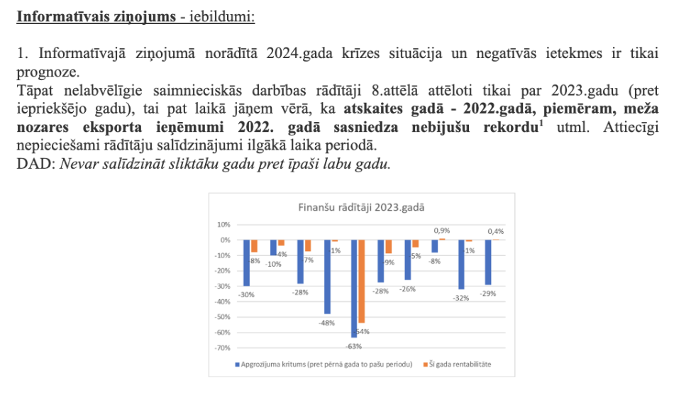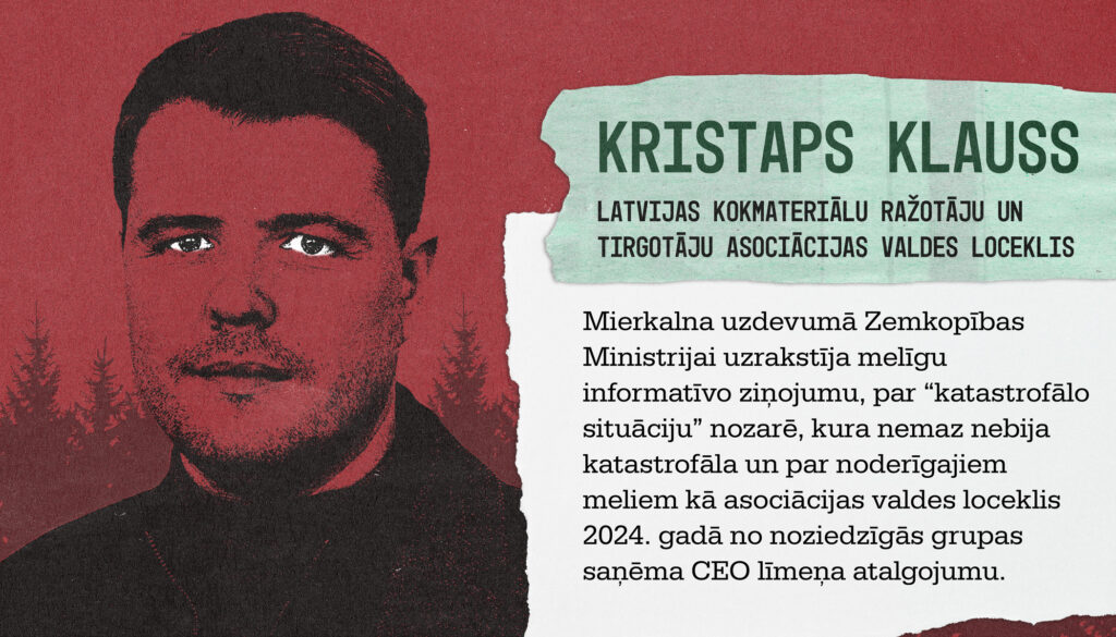 Lai panāktu iespaidu par “ārkārtas situāciju” Kristaps Klauss uzrakstīja melīgu Zemkopības Ministrijas informatīvo ziņojumu “Par Latvijas kokrūpniecības nozares konkurētspēju negatīvi ietekmējošo faktoru mazināšanu” (skat. dokumentu Nr 2.). Tajā teikts, ka 2023. gadā Latvijas zāģētavas zaudējot Ziemeļvalstu zāģētavām konkurencē augsto resursu cenu dēļ un aicināja LVM tirgus stabilizācijai veikt cenu korekcijas uz leju attiecībā uz II šķiras skuju koku zāģbaļķiem. Tajā ne vārda netika teikts par noziedzīgās grupas uzņēmumu super peļņām 2020., 2021. un 2022. gados, jo tad nāktos atzīties, ka tauku, lai pārdzīvotu grūtos laikus, “nozarei” vai noziedzīgajai grupai ir vairāk kā vajag.