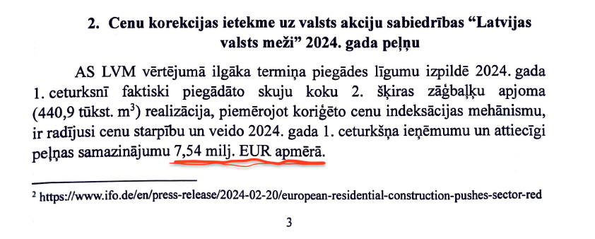 Jau pusgadu vēlāk – 2024. gada vidū tapušā jaunā Zemkopības ministrijas informatīvajā ziņojumā skaidri un gaiši ir teikts, ka šī “korekcija”, kā viņi smalkā vārdā to nosauc, LVM peļņu 2024. gada 1. ceturksnī samazināja par aptuveni 7.5 miljoniem Euro (Skat. dokumentu Nr. 5.).