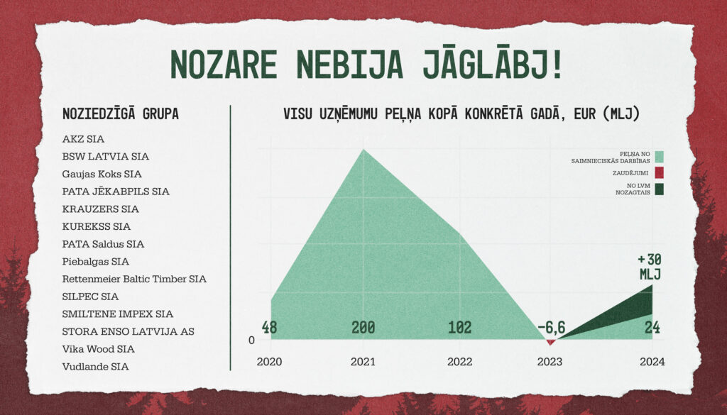 2023. gads tiešām kokrūpniecības nozarē nebija izcils. Noziedzīgās grupas uzņēmumu kopējie zaudējumi pārsniedza 6,6 miljonus Euro. Tomēr āķis slēpās citur – vismaz trīs iepriekšējie gadi lielākai daļai no noziedzīgās grupas zāģētavām bija vienkārši fantastiski. To kopējā peļņa 2020. gadā bija 48 miljoni Eur, 2021. gadā gluži kā bankām – 201 miljons Euro, bet 2022. gadā – 102 miljoni Eur. Tātad 2023. gadā (kad bija jāglābj no 6,6 miljonu Eur zaudējumiem) noziedzīgā grupa iesoļoja ar 351 miljonu Eur kopējo iepriekšējo triju gadu peļņu. Drīzāk tādi būtu jāglābj no liekas izšķērdības, nevis jāmet pakaļ valsts miljoni.