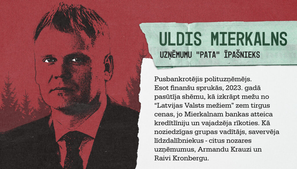 Grūtākā kā citi situācijā sevi bija iedzinis kāds uz maksātnespējas robežas balansējošs uzņēmējs Uldis Mierkalns, kura biznesa loģika un sekmes līdz šim bija balstījušās uz sētas durvju pieeju LVM un spēju izkrāpt vērtīgāku resursu maksājot par to lētāka resursa cenu. Lasītājs atcerēsies kā 2020. gadā Mierkalns maksāja LVM par lētāko tehnisko koksni, kura Liepājas ostā pēkšņi pārvērtās ievērojami dārgākajā papīrmalkā un uz valsts rēķina viņam deva nelikumīgu virspeļņu. LVM dīvainais aklums kā šajā tā arī citos gadījumos bija balstīts Mierkalna tukšajos solījumos uzbūvēt pārstrādes rūpnīcu, kura pat skiču projekta līmenī nav tapusi vēl šodien.